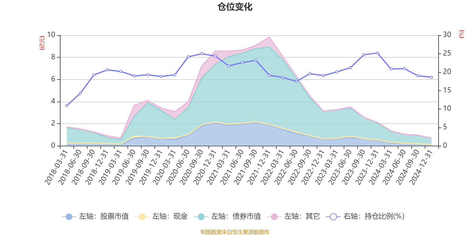 据定期报告数据统计,近三年平均股票仓位为20.44%,同类平均为18.74%。2023年末基金达到25.19%的最高仓位,2018年一季度末最低,为10.92%。